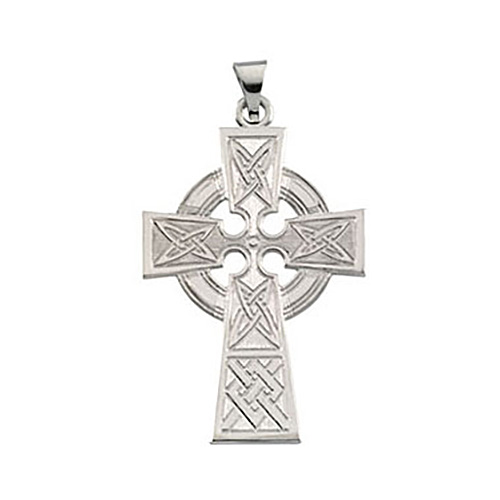 Polished 14kt white gold celtic cross pendant. Dimensions: 33mm x 23mm. This item is slightly larger than a half dollar. Fits up to a 3mm wide chain. Weighs 4.08 grams. Please note: weight is approximate, actual weight may vary. Chain not included.