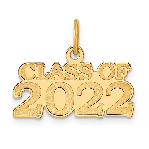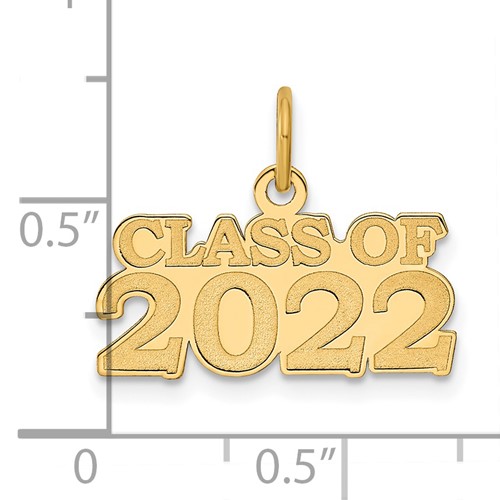 This class of 2022 charm is made of polished 14k yellow gold. Item width: 11/16in. This charm is the size of a dime. Fits up to a 3.5mm wide chain. Item weighs approximately 0.7 grams. Made in USA.