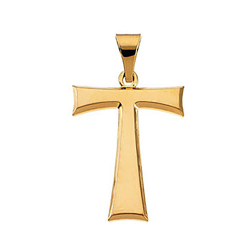 Tau cross pendant is made of polished 14k yellow gold. Item size: 3/4in x 5/8in. This cross is the size of a penny. Fits up to a 3mm wide chain. Weighs 2.17 grams. Please note: weight is approximate, actual weight may vary.