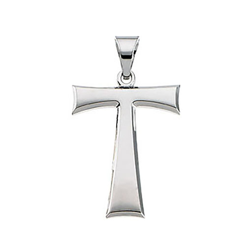 Tau cross pendant is made of polished solid 14k white gold. Item size: 3/4in x 5/8in. This cross is the size of a penny. Fits up to a 3mm wide chain. Weighs 2.17 grams. Please note: weight is approximate, actual weight may vary.