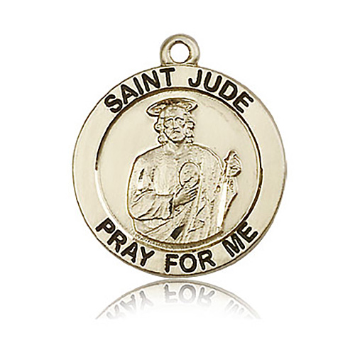This round St. Jude medal is made of gold-filled sterling silver. Inscription: SAINT JUDE PRAY FOR ME. Dimensions: 1in x 7/8in. This item is the size of a nickel. Die struck, hand-engraved. Made in USA.