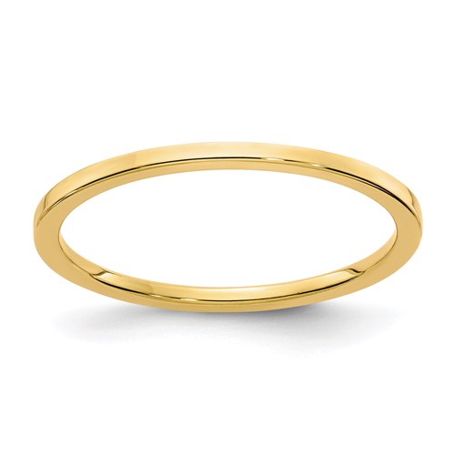 This very slender flat stackable ring is made of solid 14k yellow gold. Polished finish. Ring width: 1.2mm. Standard fit. Thickness: 1.4mm. Ring size 7 approximate weight: 1.2 grams. Made in USA.