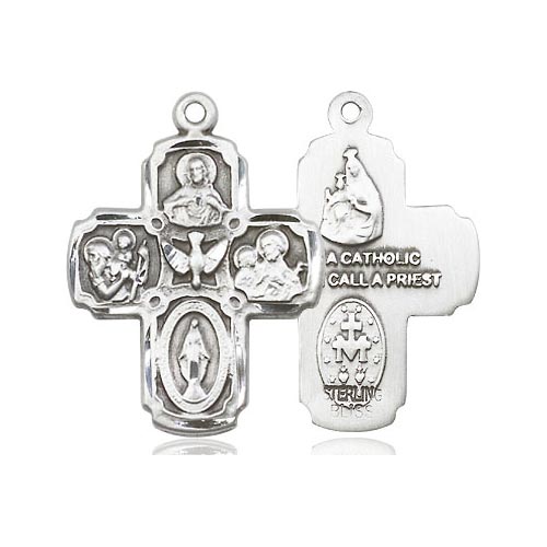 Die struck, hand-engraved five way medal is made of sterling silver. The back is engraved with I AM A CATHOLIC PLEASE CALL A PRIEST. Item size: 3/4in x 1in. This item is the size of a quarter. Made in USA.