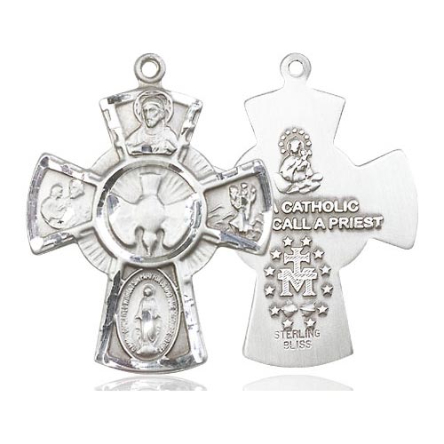 This men's hand-engraved five way medal is made of sterling silver. Item size: 7/8in x 1 1/8in. This item is slightly larger than a quarter. The reverse has the words: I AM A CATHOLIC PLEASE CALL A PRIEST. Fits up to a 3mm wide chain. Made in USA.