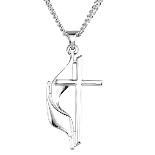 Polished sterling silver methodist cross pendant with 24-inch sterling silver curb chain and gift box. This item is larger than a quarter. Dimensions: 30mm x 17.5mm. This distinctive design incorporating the flame of the Holy Spirit and the cross of Christ was adopted in 1968 as the official symbol of the United Methodist Church. Weighs 8.88 grams. Please note: weight is approximate, actual weight may vary.