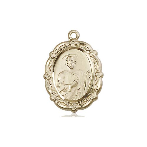 St Jude medal with wreath border is made of gold filled sterling silver. Dimensions: 7/8in x 5/8in. This item is the size of a nickel. Die struck, hand-engraved. Made in USA.