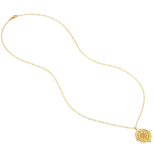 This diamond-cut compass necklace is made of solid 14k yellow gold. Pendant size: 1in x 1in. The pendant dangles from a 14k yellow gold 22 inch paper clip link chain with lobster clasp. Weight: 5.2 grams. Made in Turkey. Ships from USA.