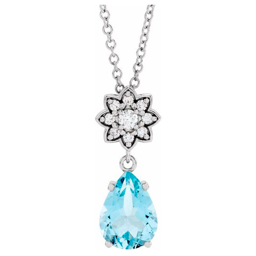 This floral inspired 0.75 carat peat-shaped aquamarine with genuine diamond accents necklace is set in 14k white gold. 14k white gold 16in to 18in adjustable cable chain has a spring ring clasp. Gemstone details: 8mm x 5mm pear cut aquamarine, AA quality. Nine round genuine diamond accents, .08 ct tw, G-H color, I1 clarity. Weight: 2.3 grams. Please note: weight is approximate, actual weight may vary.