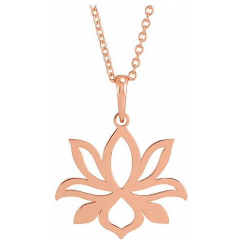 14k rose gold lotus flower necklace has a cut-out design and a polished finish. Pendant size: 5/8in x 5/8in without bail. 14k rose gold adjustable 16in to 18in cable chain has a spring ring clasp. Chain width: 1mm. Weight: 2.7 grams. Made in USA.