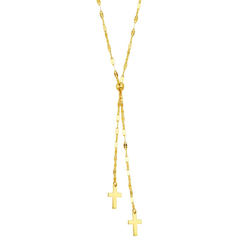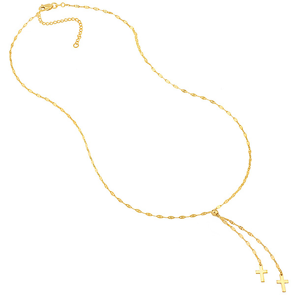 Dangling crosses adjustable lariat necklace is made of 14k yellow Gold. Diamond-cut 18 inch slender curb chain has a two inch extender. Lobster clasp. Made in Turkey. Ships from USA.