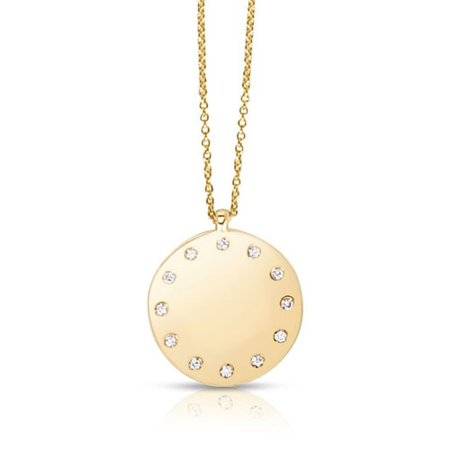 This 14k yellow gold small round dial necklace has 12 genuine round diamond accents along its border. Pendant size: 5/8in x 5/8in without bail. 14k yellow gold 18in cable chain has jump rings at 16in and 17in and a lobster clasp at the end. Approximate weight: 3.2 grams. Made in Turkey.