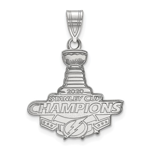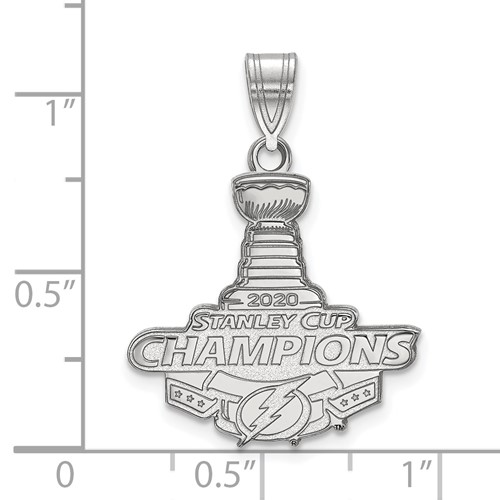 Tampa Bay Lightning 2020 Stanley Cup champions pendant is made of polished sterling silver. Item length: 3/4in, width: 3/4in. Officially licensed NHL jewelry. Fits up to a 3.5mm chain. Weight: 2.4 grams. Made in the USA.