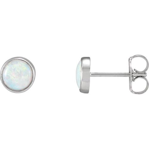 These bezel set 5mm opal cabochon stud earrings are made of 14k white gold. AAA quality Australian opal. Approximate weight: 0.9 grams. Posts with friction backs. Made in USA.