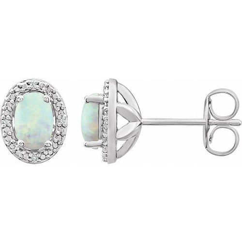 Sterling silver created opal halo style earrings have eight diamond accents. 6mm x 4mm oval created opals. Eight 0.003 ct genuine round single cut diamonds, I-J color, I2 clarity. Posts with friction backs. Approximate weight: 1.7 grams.