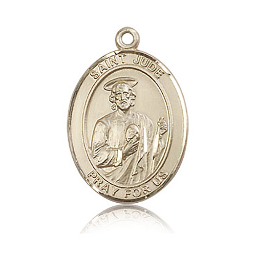 Gold filled sterling silver oval St Jude medal is die struck and hand-engraved. Dimensions: 1in x 3/4in. This item is the size of a quarter. Inscription: SAINT JUDE PRAY FOR US. Die struck, hand-engraved. Made in USA.