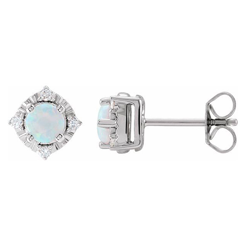 Sterling silver 1.0 carat total weight created opal earrings with diamond accents have a halo style setting. Two 4.5mm round lab created opals. Eight round natural genuine diamond accents, .04 carat total weight, I2 clarity, H color. Import.