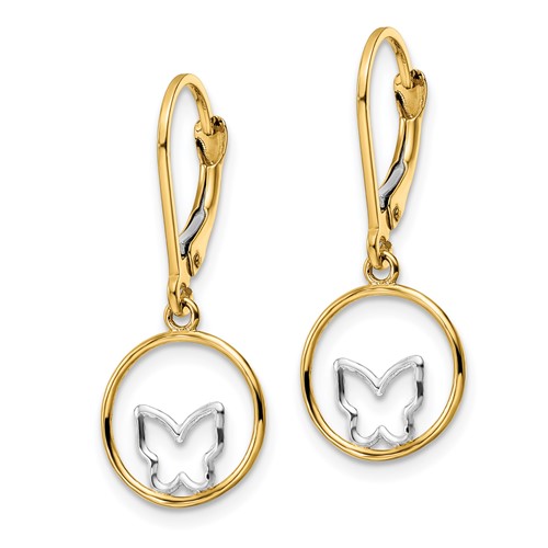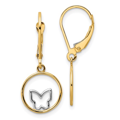 14k yellow gold butterfly in circle leverback dangle earrings have rhodium accents. Earring size: 3/8in x 1in. Approximate weight: 1.4 grams. Made in Turkey.