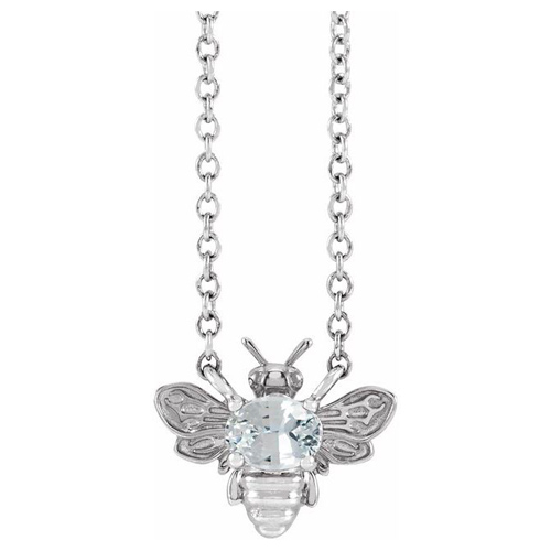 14k white gold white sapphire garnet bee necklace has a spring ring clasp. Pendant size: 10.4mm x 8.6 mm without bail. 4mm x 3mm oval genuine white sapphire, AA quality. 14k white gold 18in solid cable chain. Approximate weight: 2.2 grams. Made in USA.