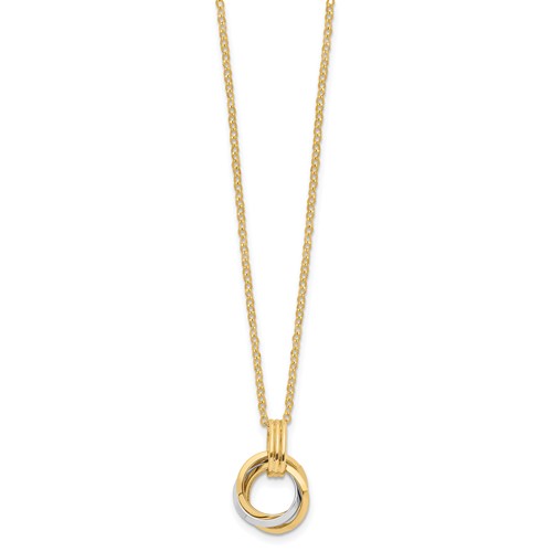 14k two tone gold intertwined three circles necklace has a polished finish. Pendant size: 5/8in x 5/8in. 14k yellow gold 16.75 inch cable chain has a lobster clasp. Approximate weight: 2.6 grams. Made in Italy.