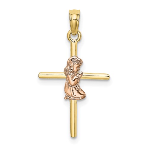 10k yellow and rose gold praying girl cross pendant has a polished finish. Item size: 9/16in x 3/4in without bail. Fits up to a 3mm wide chain. Approximate weight: 0.6 grams. Made in USA.
