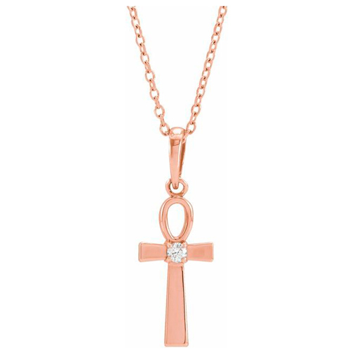 This small 14k rose gold diamond ankh cross necklace has a smooth polished finish. Pendant length: 5/8in without bail. One round full cut diamond, .03 carat, G-H color, I1 clarity. 14k yellow gold 16in to 18in adjustable cable chain has a lobster clasp. Approximate weight: 1.8 grams. Made in USA.