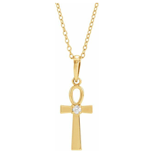 This small 14k yellow gold diamond ankh cross necklace has a smooth polished finish. Pendant length: 5/8in without bail. One round full cut diamond, .03 carat, G-H color, I1 clarity. 14k yellow gold 16in to 18in adjustable cable chain has a lobster clasp. Approximate weight: 1.8 grams. Made in USA.