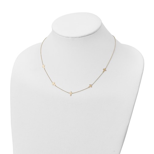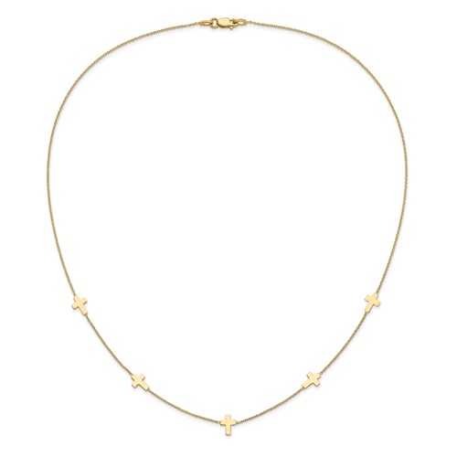 14k yellow gold Latin cross station necklace has five accents. Cross size: 6mm x 10mm. Necklace length: 18 inches. Lobster clasp. Approximate weight: 2.5 grams. Made in Italy. Ships from USA.