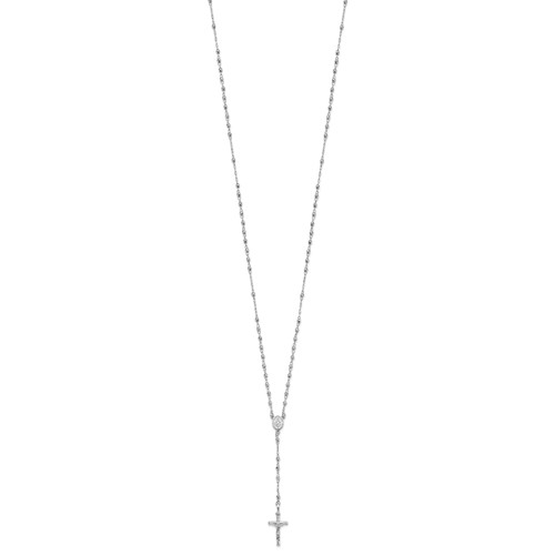 This ladies' 14k white gold rosary necklace has faceted beads. Cross size: 3/8 inch wide by 3/4 inch tall. Necklace is 18 inches long and has a lobster clasp. The rosary is a form of counted prayer using a string of beads. It consists of 15 decades, each prayed with a Hail Mary and preceded by the Lord's Prayer and followed by a Gloria Patri or Glory Be. Each decade is associated with a meditation on a sacred mystery in Jesus' life. Approximate weight: 4.7 grams. Made in Dominican Republic. Ships from USA.
