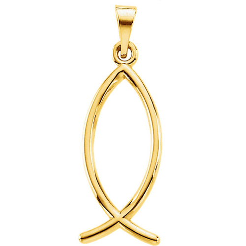 Christian fish / ichthys pendant is made of polished solid 14k yellow gold. Dimensions: 19mm x 7.5mm. Weighs 0.78 grams. Please note: weight is approximate, actual weight may vary.