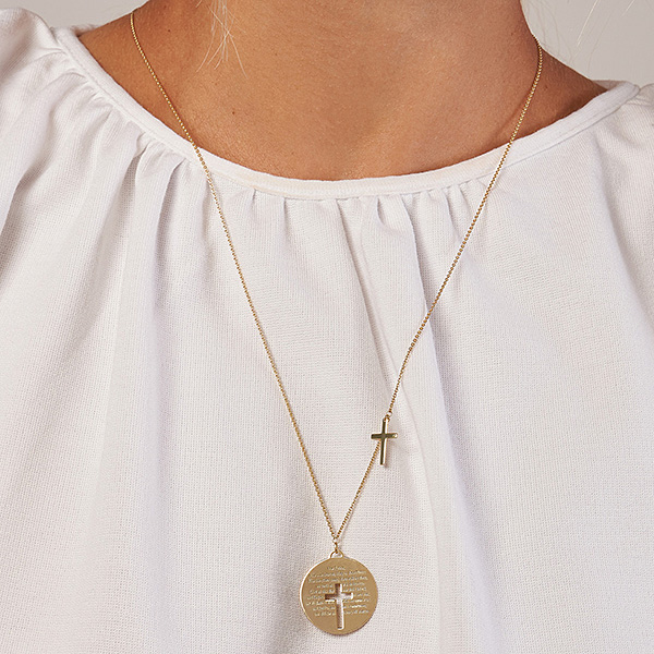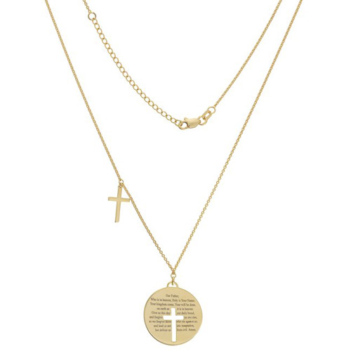 14k yellow gold lord's prayer necklace has a separate sideways cross accent. The lord's prayer is engraved on a disc. The disc is 7/8in, about the size of a nickel. 14k yellow gold adjustable 20 to 22 inch cable chain has a lobster clasp. Approximate weight: 5.1 grams. Made in Turkey. Ships from USA.