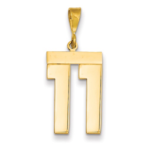 Solid 14k yellow gold number 11 pendant has a smooth polished finish. Item height: 3/4in without bail. Fits up to a 3mm wide chain. Made in USA.
