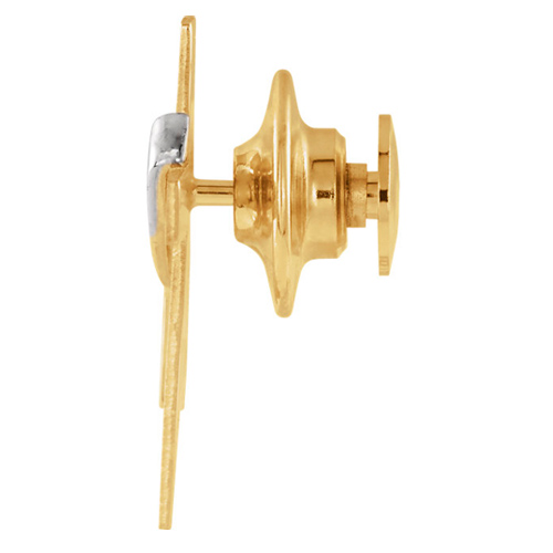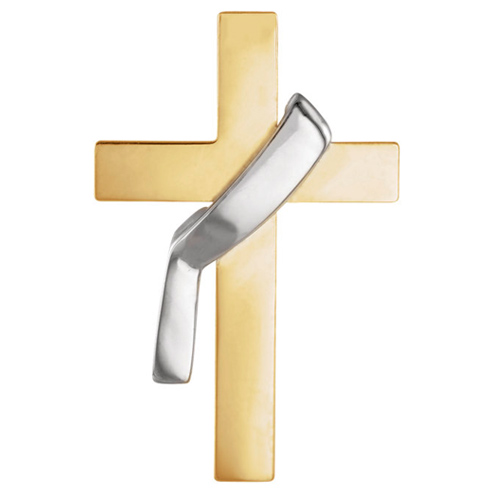 Solid 14k yellow gold cross lapel pin has a white gold sash accent. Item size: 22mm x 14mm. Approximate weight: 1.17 grams.