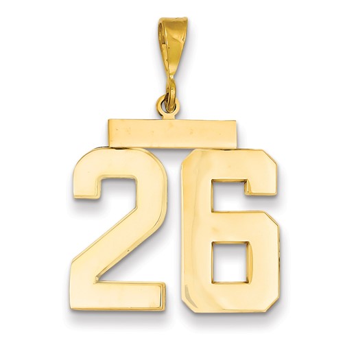 Solid 14k yellow gold number 26 pendant has a smooth polished finish. Item height: 3/4in without bail. Fits up to a 3mm wide chain. Made in USA.