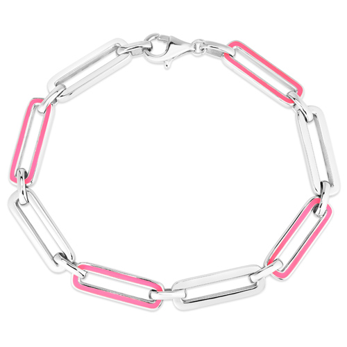 This playful sterling silver pink enamel paperclip bracelet has a lobster clasp. Bracelet length: 7in. Approximate weight: 8.5 grams. Made in Turkey. Ships from USA.