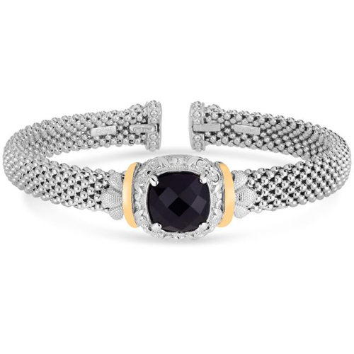 Phillip Gavriel sterling silver popcorn bangle bracelet has a cushion cut black onyx center stone and 18k yellow gold accents. One size fits most women. Bracelet width: 8mm. Made in Italy. Ships from USA.
