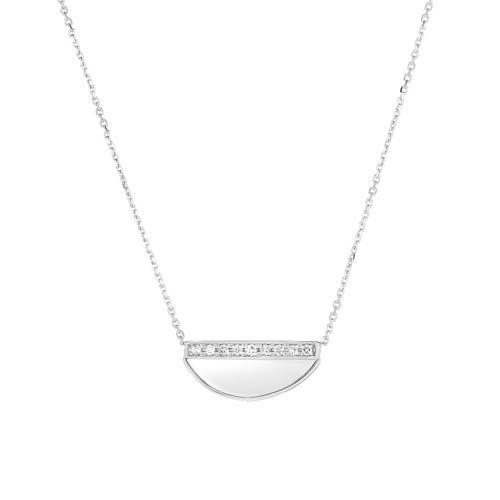 14k white gold half moon diamond necklace has a lobster clasp. A row of nine genuine natural diamond accents sparkles on top of the crescent. Pendant size: 17mm x 7mm. Diamond details:. 10 carat total weight, SI1-SI2 clarity, I-J color. 14k white gold 18 inch cable chain. Approximate weight: 2.0 grams. Made in Turkey. Ships from USA.