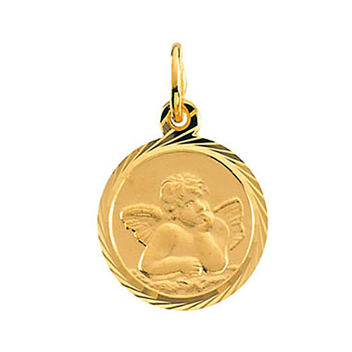 This very small Raphael angel charm is made of solid 14k yellow gold. Diameter: 12mm. This charm is half the size of a quarter. Weighs 0.65 grams. Fits up to a 2.5mm wide chain. Made in USA.