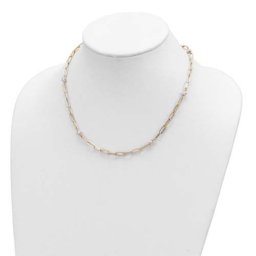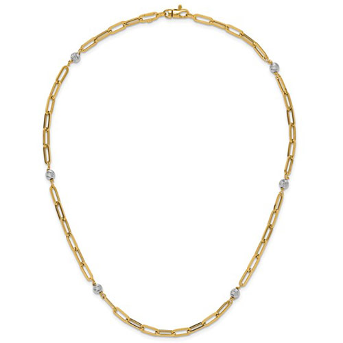 14k two-tone gold diamond-cut bead and long oval link necklace has a lobster clasp. Bead size: 4.5mm, link width: 4mm. Six bead accents. Necklace length: 18 inches. Approximate weight: 6.6 grams. Made in Italy. Ships from USA.