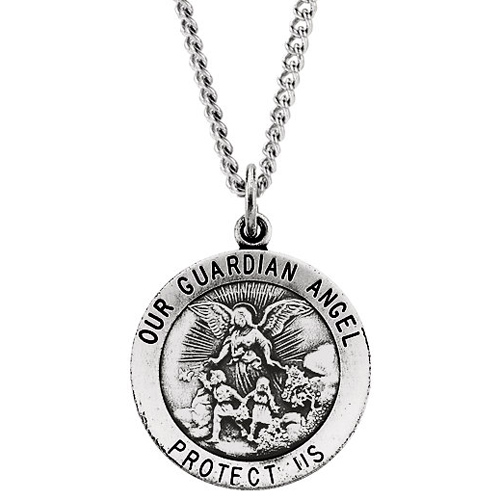 This antiqued sterling silver guardian angel medal dangles from an 24-inch sterling silver curb chain. Dimensions: 22mm x 22mm. Inscription reads OUR GUARDIAN ANGEL PROTECT US. Weighs 11.96 grams. Please note: weight is approximate, actual weight may vary.