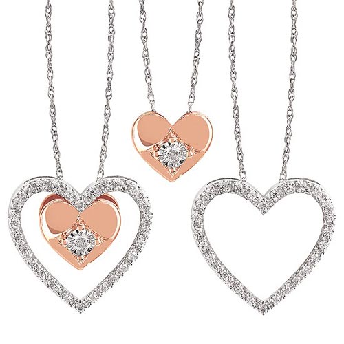 This Enhanceables two-piece diamond hearts necklace is made of 10k rose and white gold. Genuine natural round diamond accents, .14 carat total weight, I color, I1 clarity. 10k white gold adjustable 16in to 18in loose rope chain has a spring ring clasp. This versatile necklace may be worn with both pendants or just one. Made in Hong Kong and ships from USA.