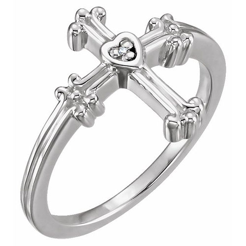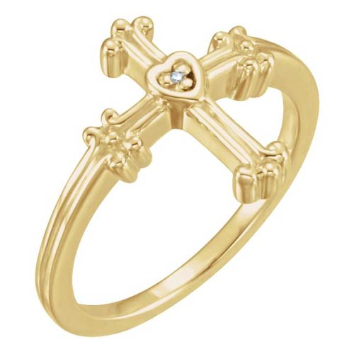 14k yellow gold chastity cross ring features a small diamond accent in the center. Diamond is .005 CT, 1mm diameter, full cut. Clarity SI, color GHI. Ring size 7 approximate weight: 4.20 grams. Standard fit. Made in USA.