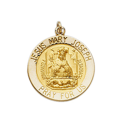 This small round Jesus, Mary and Joseph medal is made of polished 14kt yellow gold. 18mm diameter. Inscription reads: JESUS MARY JOSEPH PRAY FOR US. Weighs 2.4 grams. This item is the size of a dime. Please note: weight is approximate, actual weight may vary.