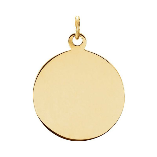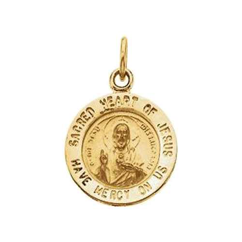 This round sacred heart of Jesus medal is made of polished 14kt yellow gold medal. 12mm diameter. Inscription reads: SACRED HEART OF JESUS HAVE MERCY ON US. Weighs 0.79 grams. Please note: weight is approximate, actual weight may vary.