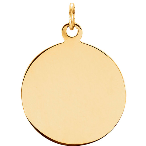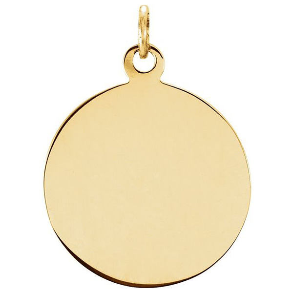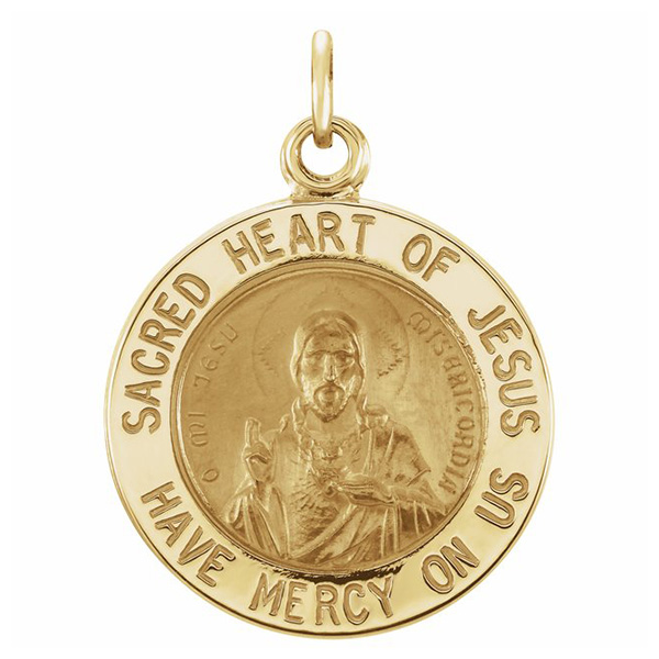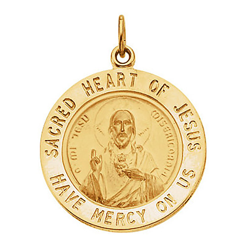 This small sacred heart of Jesus medal is made of solid 14k yellow gold. 15mm diameter. Inscription reads: SACRED HEART OF JESUS HAVE MERCY ON US. Approximate weight: 1.23 grams. Bail dimensions: 1.8mm x 2.0mm. Made in USA.