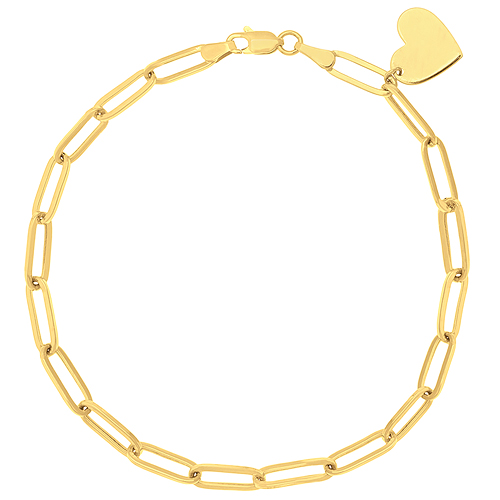 14k yellow gold paper clip bracelet has a heart charm. Hollow. Bracelet length: 7.5 inches. Lobster clasp. Approximate weight: 2.8 grams. Made in Turkey. Ships from USA.