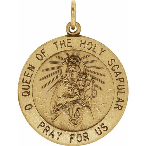 Round scapular medal is made of polished solid 14k yellow gold. 25mm diameter medal is the size of a quarter. Inscription: O QUEEN OF THE HOLY SCAPULAR MEDAL PRAY FOR US. On the back of the medal is a picture of the Sacred Heart. Weighs 5.46 grams. Fits up to a 2.25mm wide chain. Made in USA.