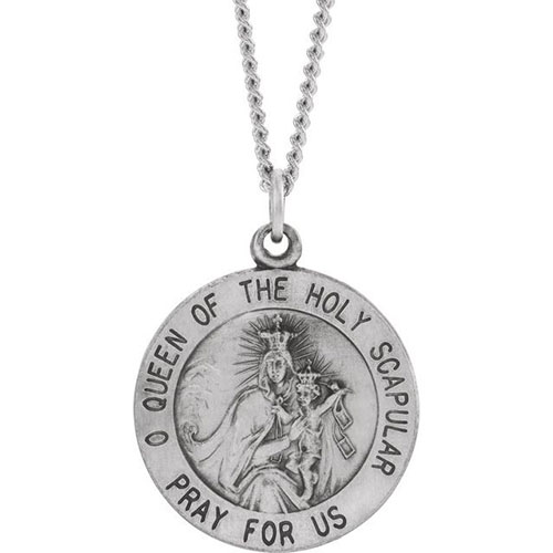 This ladies' round scapular medal necklace is made of solid sterling silver. Medal size: 18mm diameter, the size of a dime. Sterling silver 18 inch chain has a spring ring clasp. Inscription reads: O QUEEN OF THE HOLY SCAPULAR MEDAL PRAY FOR US. On the back of the medal is a picture of the Sacred Heart. Weighs 3.58 DWT (5.57 grams). Please note: weight is approximate, actual weight may vary.