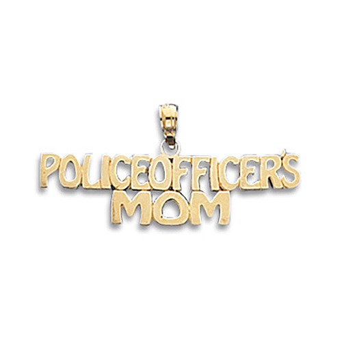 14k yellow gold Police Officer's Mom pendant shows her support and pride. This pendant measures 1 1/4 inches wide by 3/8 inches tall. Custom made in the USA.