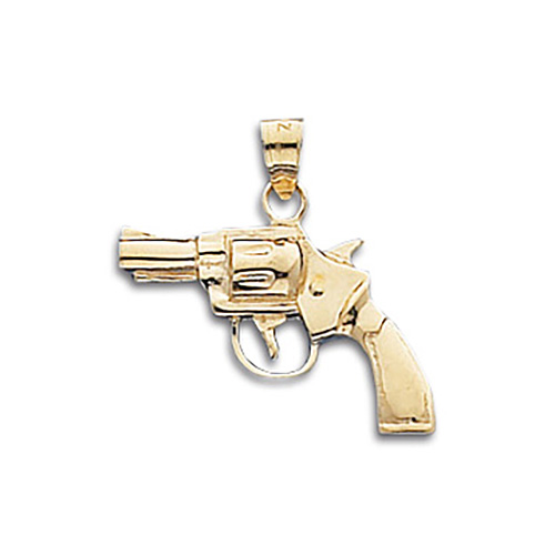 14k yellow gold revolver gun pendant has a polished finish and open back. This pendant measures 15/16 inch wide by 3/4 inch tall. Fits up to a 3mm wide chain. Custom made in the USA. Chain not included.