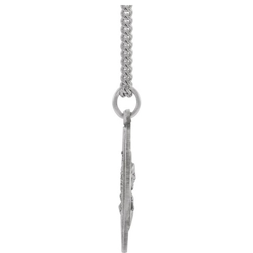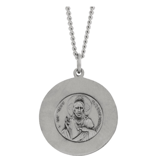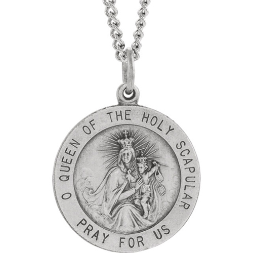 This men's round scapular medal is made of solid sterling silver with antique finish. Sterling silver 24-inch curb chain. Medal dimensions: 25mm. This item is the size of a quarter. Inscription reads: O QUEEN OF THE HOLY SCAPULAR MEDAL PRAY FOR US. On the back of the medal is a picture of the Sacred Heart. Weighs 7.48 grams. Please note: weight is approximate, actual weight may vary.